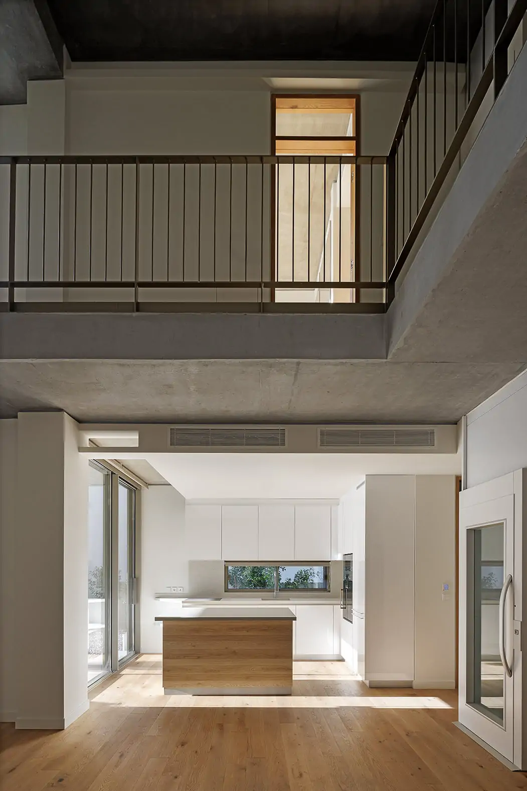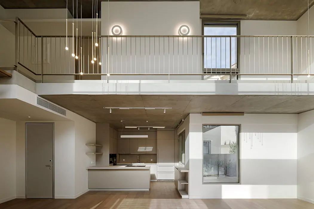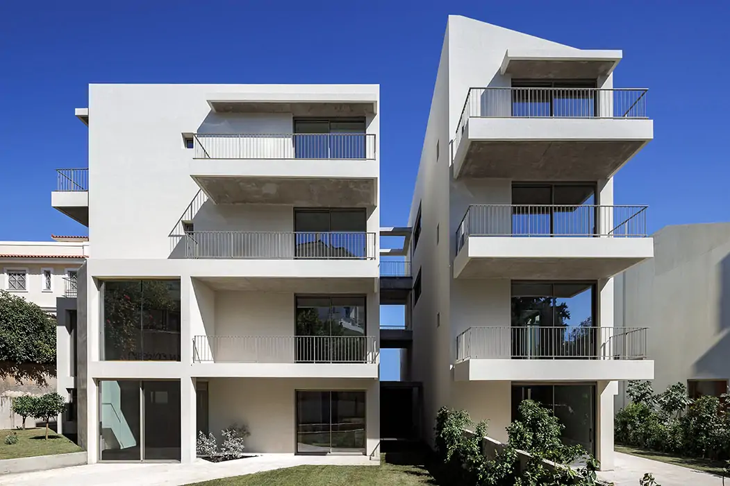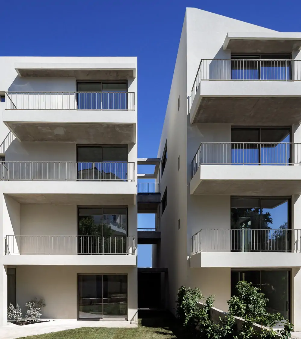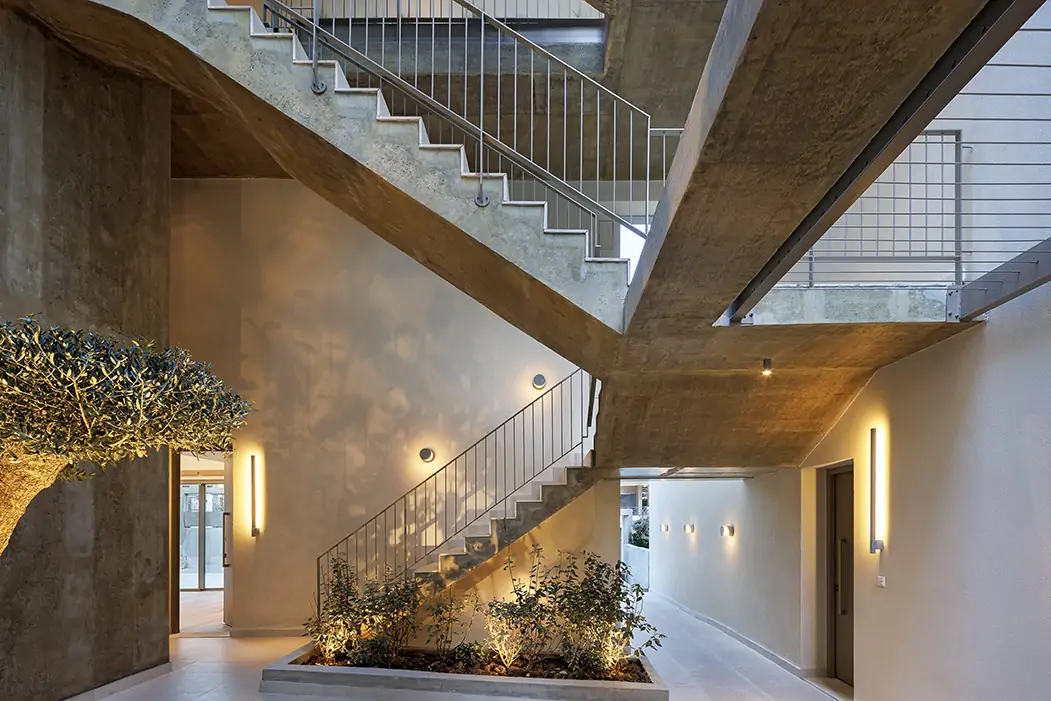 The design concept was conceived by combining two separate structures around a dynamic core, the central atrium, which also serves as the building’s shared staircase. The construction of the central atrium and the purposeful sub-division of the volumes allowed us to offer each residence independence, privacy, as well as ensuring ideal orientation and superior natural light and ventilation.